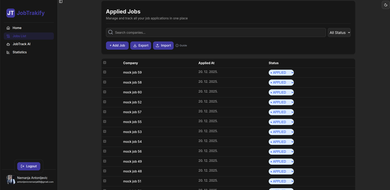 Fully featured job application tracking platform designed to help users track and optimize their job hunt. The tool supports job import/export, and the system allows users to add positions or bulk-import them manually via files. Analytics dashboards that visualize application trends. AI-powered features, including a personalized chatbot that helps users with smart insights about applied positions.